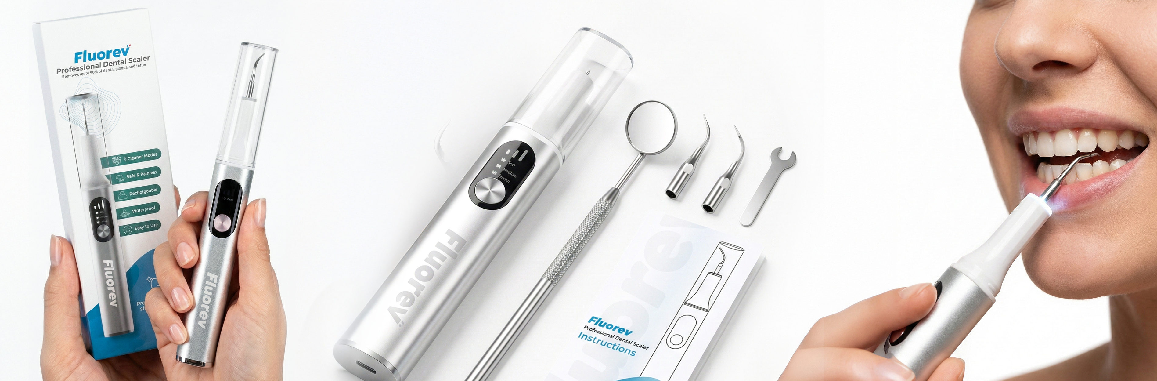 - Produit des ultrasons pour déloger et éliminer la plaque dentaire et les taches (tabac, café, etc.)