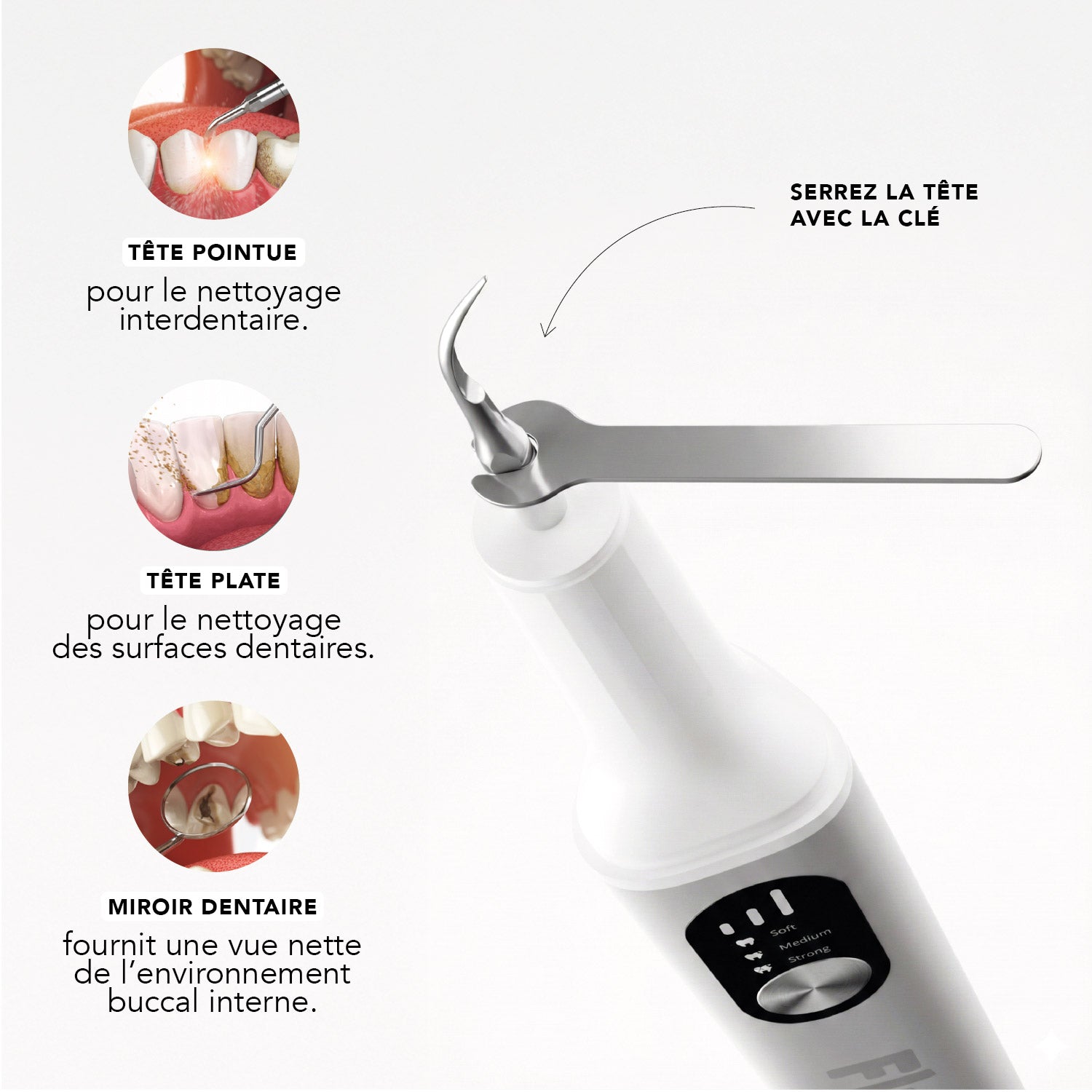 2. Serrez dans le sens des aiguilles d'une montre avec la clé, installez les embouts dentaires.